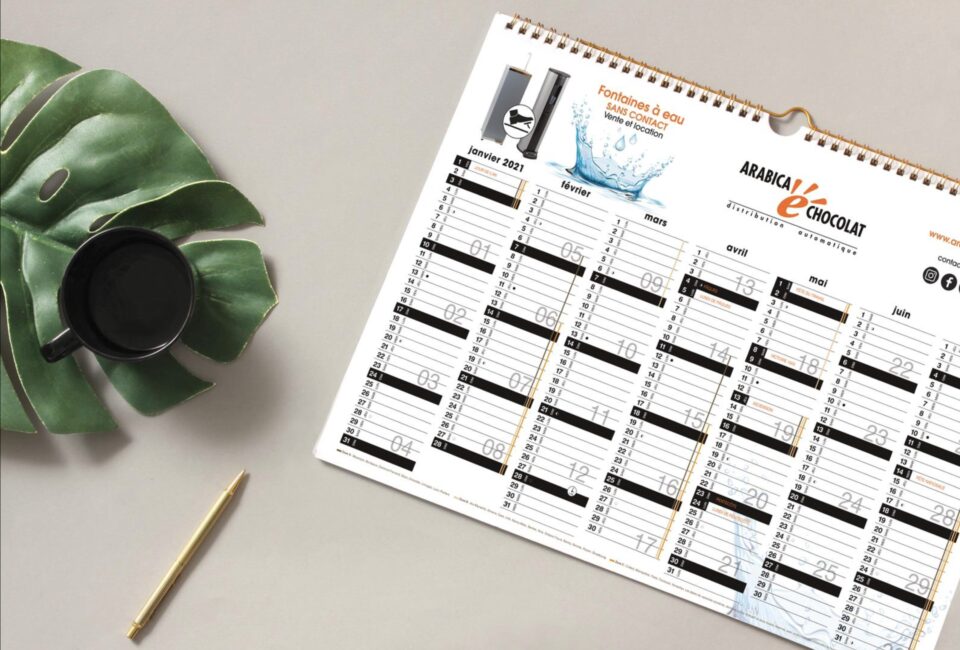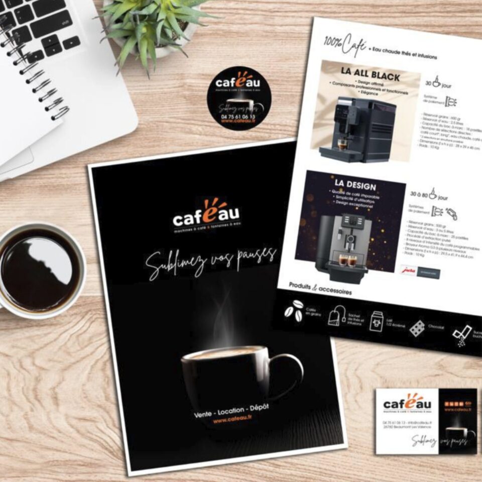 Ensemble, nous avons développé différents supports : étiquette de pack café, plaquette commerciale, cartes de visite, calendrier et marquage véhicules.