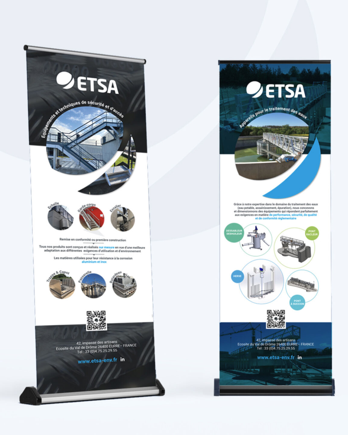 Des plaquettes commerciales et des roll-ups salon, conçus pour valoriser leur savoir-faire et capter l’attention de leurs clients et partenaires.