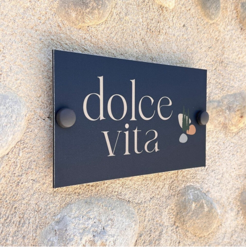 L’identité s’est ensuite déclinée sur différents supports – broderie, gravure, impression aluminium – et sur un book d’accueil sur mesure pour nos gîtes Dolce Vita et Bella Vista.